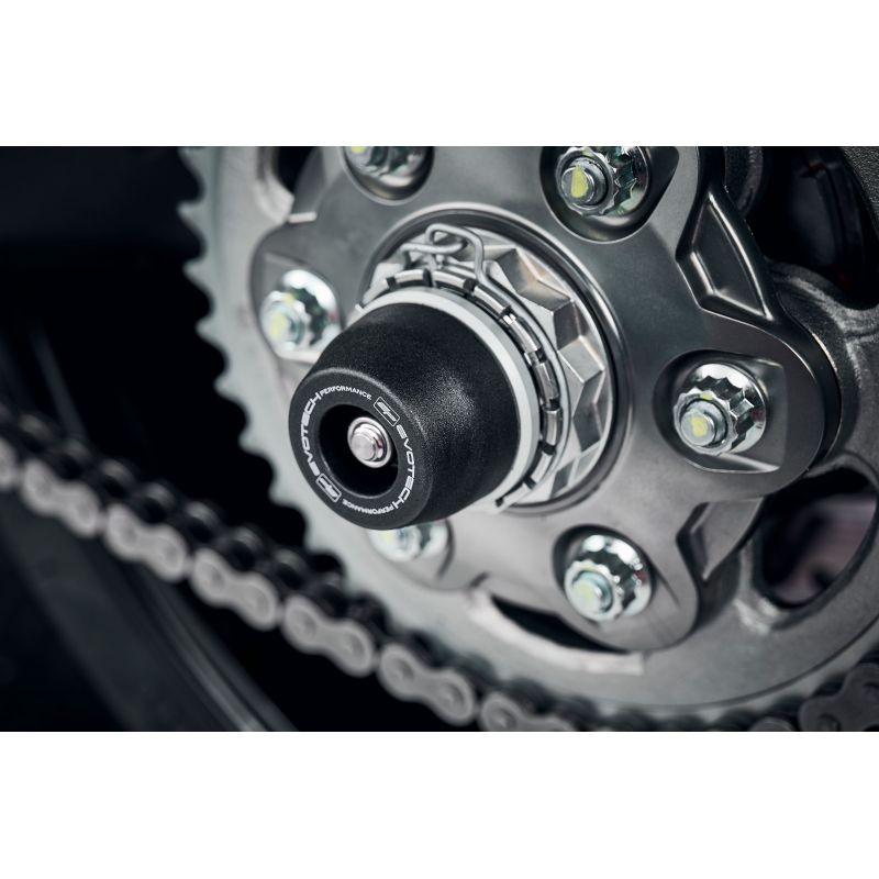 EP-Spindelspulen für die Ducati Diavel V4 bieten Schutz für die Vorderradachse, die unteren Vorderradgabeln und die Bremssättel und sind diskret, aber robust. Die schwarzen Spulen passen perfekt auf beide Seiten der vorderen Spindel und werden von einer Spindelstange mit gerolltem Gewinde an Ort und Stelle gehalten. Hinten ragt die Spindelspule aus dem Rad heraus und bietet Schutz für die Schwinge. Ein eloxierter roter Nabenanschlag sichert die Edelstahlstange an Ort und Stelle. Die langlebigen Materialien aus spritzgegossenem Nylon und Aluminium sollen im Falle eines Zwischenfalls als Erste dem Aufprall standhalten.