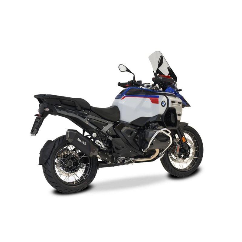 SPS RALLY is a new exhaust, very well-proportioned in size and volume, short and compact, perfect for the BMW R 1300 GS ADVENTURE. An "OPEN" silencer as it is EURO 5 PLUS approved but without DBK, in full compliance with current regulations. Thanks to this, we have obtained high performance in terms of power and torque and extracted from the BMW twin-cylinder, a pleasantly deep sound, very different from that produced by the original silencer. The silencer sleeve is in titanium and black ceramic titanium with a thickness of 0.8 mm and has a length excluding the end caps of 270 mm. The end cap is in carbon fiber Made in Italy and is characterized by a honeycomb metal protection grille in brushed stainless steel. The cover, also in carbon, takes up the stylistic layout of the rear end cap, giving the silencer a Rally character that winks at long trips and adventure. The fitting is made of stainless steel manually TIG-blown. Laser engraved logo.