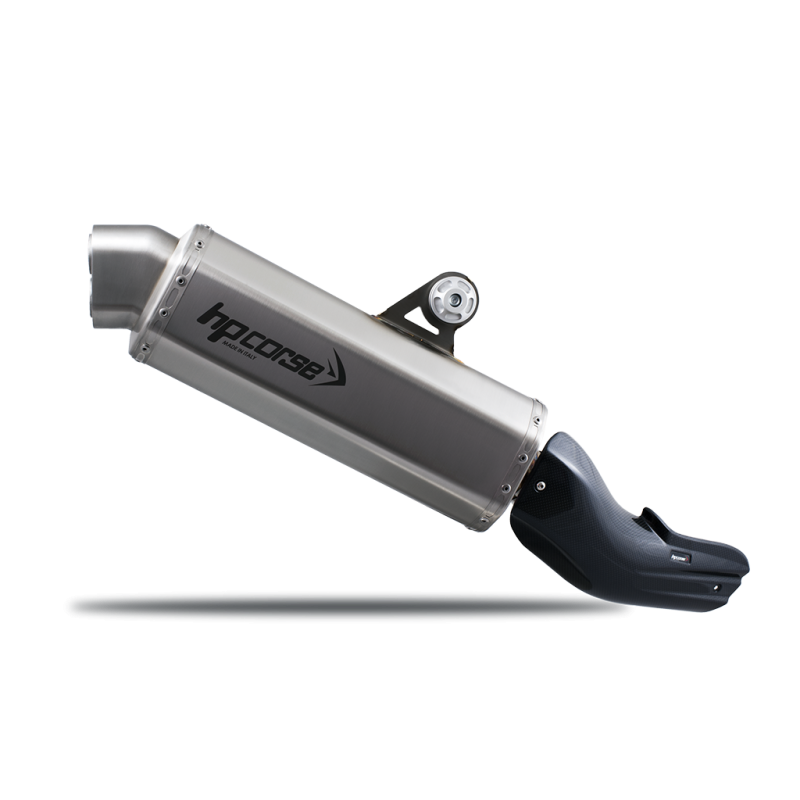 Pure and essential lines. 4-TRACK R with DBK is dedicated to the latest generation Maxi Enduro, Sport Touring/Adventure and Crossover. 4-TRACK R loves the thrill of wide open spaces and roads that disappear beyond the horizon. Designed in the Bologna R&D Center, the new HP CORSE creature is born strong, capable of withstanding the most demanding situations and the many kilometers traveled to accompany you through roads, paths, mountain passes and deserts all over the world. Tested for over a year on the test bench and on the most demanding routes, 4-TRACK R guarantees reliability and better performance than all the original exhausts it replaces, especially at low and medium revs. 4-TRACK R is light, has octagonal shaped end caps, a classic style spout but obtained using a very advanced technology that has distinguished our company's products for many years: hydroforming. A spout without welds and a silencer body with laser-engraved logo. Available in three different materials: Titanium, satin steel, black ceramic steel. APPROVED EURO 4 (EU) nr. 134/2014 and 2016/1824 G