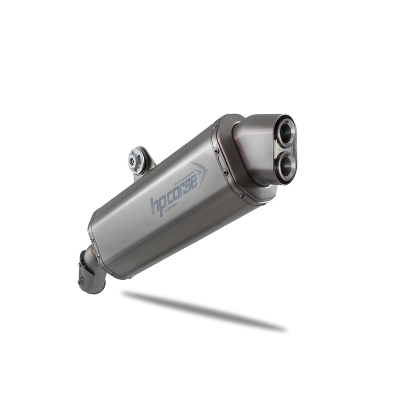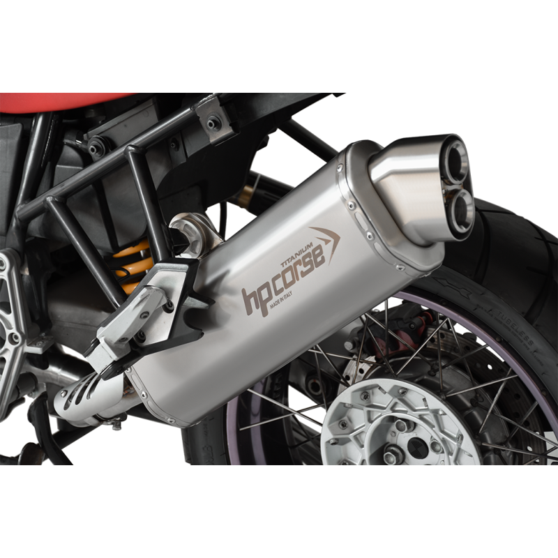 Pure and essential lines. 4-TRACK R with DBK is dedicated to the latest generation Maxi Enduro, Sport Touring/Adventure and Crossover. 4-TRACK R loves the thrill of wide open spaces and roads that disappear beyond the horizon. Designed in the Bologna R&D Center, the new HP CORSE creature is born strong, capable of withstanding the most demanding situations and the many kilometers traveled to accompany you through roads, paths, mountain passes and deserts all over the world. Tested for over a year on the test bench and on the most demanding routes, 4-TRACK R guarantees reliability and better performance than all the original exhausts it replaces, especially at low and medium revs. 4-TRACK R is light, has octagonal shaped end caps, a classic style spout but obtained using a very advanced technology that has distinguished our company's products for many years: hydroforming. A spout without welds and a silencer body with laser-engraved logo. Available in three different materials: Titanium, satin steel, black ceramic steel. APPROVED Directives and Delegated Regulations (EU) no. 134/2014 and 2016/1824 G.