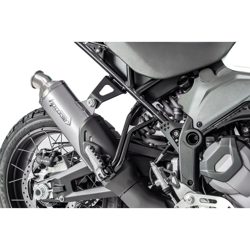 Weight of original exhaust + catalyst: 8,020 gr. Weight of SP-1 SHORT + catalyst: 6,673 gr. Weight of SP-1 SHORT + 2 IN 1 DECATALYST: 2,796 gr. To the DESERTX, a bike that is unique in many ways, we dedicate the SP-1 SHORT EVOLUTION exhaust in TITANIUM, a minimalist product capable of fully embodying the true essence of the "off road" spirit. With the SP-1 SHORT EVOLUTION the exhaust returns to its original synthesis, freeing itself from the superfluous and showing its full soul. For its design we were inspired by the great African Rallies, reinterpreting the past but looking to the future through new essential lines. The silencer body is oval in shape, the very light end caps are economically moulded, the exit spout is round with no welding at the bend angle in order to optimise the flow of exhaust gases. The HP CORSETITANIUM LOGO is laser engraved. The SP-1 SHORT has a HIGH-PASS SLIP-ON CONNECTOR or a LOW-PASS one with quick release using springs and can be installed on the original catalyst or on the HP CORSE 2-in-1 DECATALYSED CONNECTOR (in this case the use of the terminal is permitted only and exclusively on closed circuits and not on roads open to the public). The SP-1 SHORT EVOLUTION outlet nozzle dedicated to the DESERTX in the LOW-PASS version is different from the model mounted on the standard SP-1 SHORT as it has a steeper lean angle to prevent the fumes from indirectly hitting the indicator, overheating it and giving the bike itself a more "rally" look. Euro 5 approved, the SP-1 SHORT has a 300 mm long TITANIUM SLEEVE with a NATURAL or BLACK TITANIUM finish.