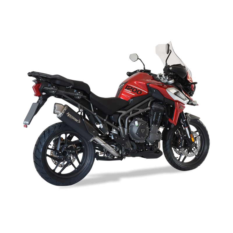 The new Triumph Tiger 1200 family includes motorcycles designed to be ridden with fun and safety in mind at all times, with innovative technologies, optimised ergonomics and significant engine updates. As with the previous model, there are two categories: the XR models, designed to achieve excellence on the road, while the XC models guarantee the best experience on any surface, ON or OFF. The new models also retain their great handling, a high riding position and a strong profile for superior style, control and comfort. The new Tigers have an incredibly powerful 1215cc 3-cylinder engine and a lower weight than the previous generation. To make this new generation of TIGER 1200 even more surprising, HP CORSE has dedicated a new line of muscular and powerful exhausts. Available in three different materials (Titanium, Satin Steel, Black Steel) and with strong but slender shapes, they are able to redesign the rear area of the English maxi enduro bike, enhancing its aesthetic qualities, handling and sound. Tested on the bench and on the road, they guarantee great reliability, a reduced weight compared to the original Triumph as well as improving the performance of the three-cylinder from Hinckley, especially at low and medium revs. Euro 4 approved, they have an octagonal shaped bottom, a hydroformed spout without welding or in carbon fibre. EURO 4 APPROVED (EU) no. 134/2014 and 2016/1824 G.