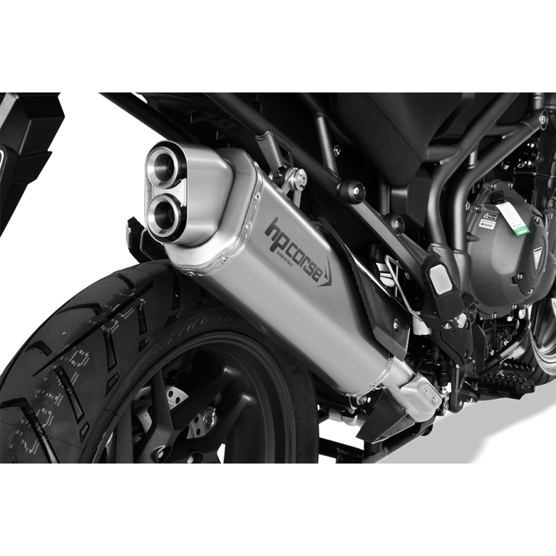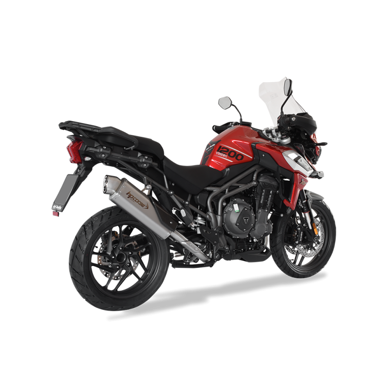 The new Triumph Tiger 1200 family includes motorcycles designed to be ridden with fun and safety in mind at all times, with innovative technologies, optimised ergonomics and significant engine updates. As with the previous model, there are two categories: the XR models, designed to achieve excellence on the road, while the XC models guarantee the best experience on any surface, ON or OFF. The new models also retain their great handling, a high riding position and a strong profile for superior style, control and comfort. The new Tigers have an incredibly powerful 1215cc 3-cylinder engine and a lower weight than the previous generation. To make this new generation of TIGER 1200 even more surprising, HP CORSE has dedicated a new line of muscular and powerful exhausts. Available in three different materials (Titanium, Satin Steel, Black Steel) and with strong but slender shapes, they are able to redesign the rear area of the English maxi enduro bike, enhancing its aesthetic qualities, handling and sound. Tested on the bench and on the road, they guarantee great reliability, a reduced weight compared to the original Triumph as well as improving the performance of the three-cylinder from Hinckley, especially at low and medium revs. Euro 4 approved, they have an octagonal shaped bottom, a hydroformed spout without welding or in carbon fibre. EURO 4 APPROVED (EU) no. 134/2014 and 2016/1824 G.