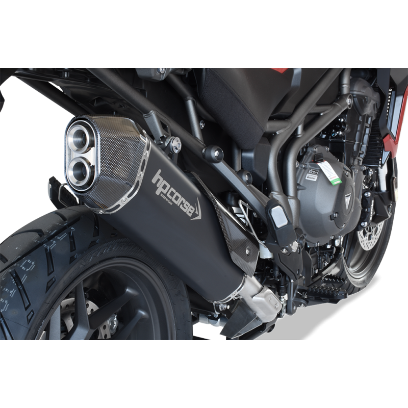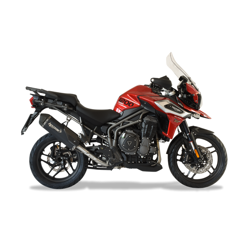 The new Triumph Tiger 1200 family includes motorcycles designed to be ridden with fun and safety in mind at all times, with innovative technologies, optimised ergonomics and significant engine updates. As with the previous model, there are two categories: the XR models, designed to achieve excellence on the road, while the XC models guarantee the best experience on any surface, ON or OFF. The new models also retain their great handling, a high riding position and a strong profile for superior style, control and comfort. The new Tigers have an incredibly powerful 1215cc 3-cylinder engine and a lower weight than the previous generation. To make this new generation of TIGER 1200 even more surprising, HP CORSE has dedicated a new line of muscular and powerful exhausts. Available in three different materials (Titanium, Satin Steel, Black Steel) and with strong but slender shapes, they are able to redesign the rear area of the English maxi enduro, enhancing its aesthetic qualities, handling and sound. Tested on the bench and on the road, they guarantee great reliability, a reduced weight compared to the original Triumph as well as improving the performance of the three-cylinder from Hinckley, especially at low and medium revs. Euro 4 approved, they have an octagonal shaped bottom, a hydroformed spout without welding or in carbon fibre.