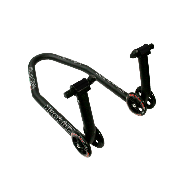 Born from research and with an absolutely innovative design, Black Ice is the new patented Bike-Lift trestle line. A pair of adjustable universal front and rear stands, equipped with the new Bike-Lift patented inserts and made of ultra-resistant material and featuring an absolutely innovative and revolutionary adjustment system. A trestle made of ø40mm steel tube that guarantees greater rigidity, stability and a lower weight. Equipped with the newest Bike-Lift 120mm diameter wheels in superlight nylon.