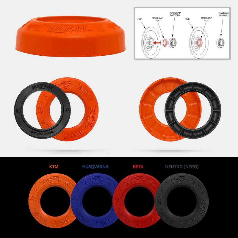 Racecap™ System è il sistema completo che comprende la cuffia Racecap™ FastDry + La protezione parapolvere Racecap™ FLC. Il brevetto Racecap™ Fastdry assieme al brevetto Racecap™ FLC permettono di mantenere il cuscinetto in ambiente asciutto evitando ristagno ed evacuando rapidamente liquidi e sporcizia. La sostituzione del parapolvere con Racecap™ FLC riduce notevolmente gli attriti aumentando le prestazioni. Il sistema di protezione per cuscinetti ruote Racecap System garantisce una durata superiore dei cuscinetti e riduce notevolmente gli attriti, aumentando le prestazioni. Le cuffie protettive sono progettate per garantire una maggior durata dei cuscinetti delle ruote, proteggendo maggiormente la zona dal getto dell'idropulitrice e dagli agenti atmosferici. Racecap™ System è l'evoluzione del Racecap Fastdry, un sistema che oltre a proteggere i cuscinetti con le famose cuffie brevettate è in grado di ridurre gli attriti delle ruote in fase di funzionamento. Per ridurre gli attriti Racecap™ ha ideato e brevettato il componente FLC, tale prodotto deve essere montato in sostituzione al parapolvere originale. Grazie alla sua particolare conformazione, sfruttando la forza centrifuga, forza l'uscita dell'eventuale acqua penetrata nella protezione. L'innovazione principale risiede però nel rivoluzionario sistema di tenuta effettuato sul cuscinetto al contrario del tradizionale sistema che lo attua sul distanziale. Essendo il cuscinetto e il componente FLC solidali nella rotazione non si creano più i precedenti attriti. L'eliminazione dell'attrito porta a due sensibili benefici. Il primo dato dal fatto che la ruota non sarà più frenata. Il secondo dato dall'eliminazione dell'usura della tenuta, rendendo questo componente più duraturo e affidabile nel tempo. Le cuffie Racecap™ si montano semplicemente fissandole ai distanziali originali delle ruote. Per alcuni modelli è necessario l'utilizzo di un apposito distanziale già incluso nella confezione. La confezione del kit comprende 2 cuffie, due tenute FLC e i relativi adattatori necessari per una singola ruota. Nelle moto provviste di paradisco anteriore non è possibile utilizzare la cuffia corrispondente.