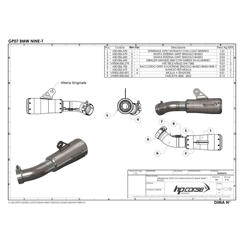 Un gran escape nunca sucede por casualidad. Nace del sueño de quien lo imagina, de la experiencia y de las manos expertas de quien forja el metal y luego lo fabrica. Un gran escape se reconoce por sus líneas limpias y esenciales y por el encanto que puede transmitir. La miras y ves las ganas de libertad y todas tus ganas de correr, reconoces tus propias emociones, aquellas que te transforman en un auténtico “centauro”, algo único e inseparable de tu moto. El escape GP-07 es el más corto y compacto de los escapes HP CORSE, creado para garantizar a nuestros clientes emociones fuertes. El GP-07 está construido en acero inoxidable utilizando una nueva tecnología que le da al escape líneas sinuosas y suaves. Los fondos de caja están estampados en acero inoxidable muy ligero y luego cepillados a mano. Las soldaduras, también realizadas a mano, se dejan visibles intencionadamente para realzar el cuidado y la maestría artesanal de quien las realiza. Podrás elegir entre dos “boquillas de salida” diferentes: en aluminio macizo y con malla metálica. APROBADO Directiva 97/24/CE-2006/120/CE cap.9