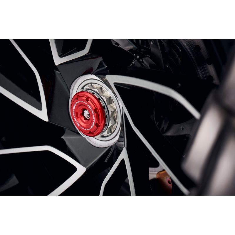 Ofreciendo protección al eje de la rueda delantera, a las horquillas delanteras inferiores y a las pinzas de freno, las bobinas de eje EP para la Ducati Diavel V4 son discretas pero fuertes. Las bobinas negras encajan perfectamente a ambos lados del eje delantero y se mantienen en su lugar mediante una varilla del eje de hilo enrollado. En la parte trasera, la bobina del eje sobresale de la rueda y ofrece protección al basculante, y un tope de cubo rojo anodizado asegura la varilla de acero inoxidable en su lugar. Se espera que los materiales duraderos de nailon y aluminio moldeados por inyección sean los primeros en resistir el impacto en caso de que ocurra un incidente.