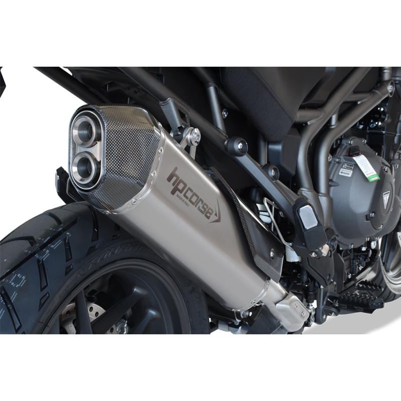 La nouvelle famille Triumph Tiger 1200 comprend des motos conçues pour être conduites en mettant l'accent sur le plaisir et la sécurité à tout moment, avec des technologies innovantes, une ergonomie optimisée et des mises à jour importantes du moteur. Comme pour l'ancien modèle, il existe deux catégories : les modèles XR, conçus pour atteindre l'excellence sur la route, tandis que les modèles XC garantissent la meilleure expérience sur n'importe quelle surface, ON ou OFF. Les nouveaux modèles conservent leur excellente maniabilité, leur position de conduite haute et leur profil pointu pour un style, un contrôle et un confort supérieurs. Les nouveaux Tigers sont dotés d'un moteur 3 cylindres de 1215 cm3 incroyablement puissant et pèsent moins que les générations précédentes. Pour rendre cette nouvelle génération de TIGER 1200 encore plus surprenante, HP CORSE lui a dédié une nouvelle ligne d'échappements musclés et puissants. Disponibles en trois matériaux différents (Titane, Acier Satiné, Acier Noir) et avec des formes fortes mais élancées, ils sont capables de redessiner la zone arrière du maxi vélo d'enduro anglais, améliorant ses qualités esthétiques, sa maniabilité et son son. Testés sur banc et sur route, ils garantissent une grande fiabilité, un poids réduit par rapport au Triumph d'origine ainsi qu'une amélioration des performances du trois cylindres Hinckley notamment à bas et moyen régime. Homologués Euro 4, ils disposent d'un fond de forme octogonale, d'un bec hydroformé sans soudure ou en fibre de carbone.