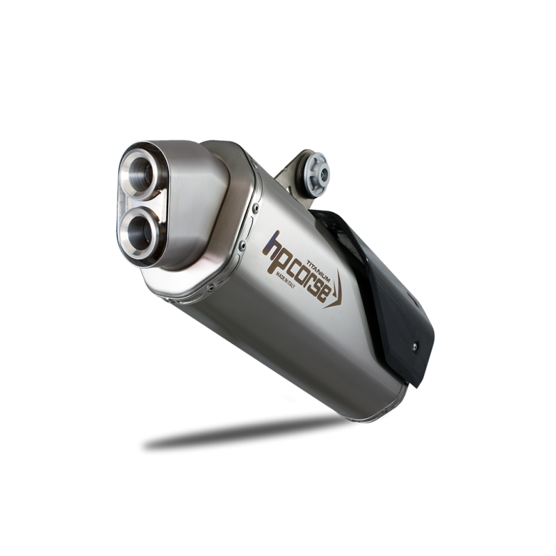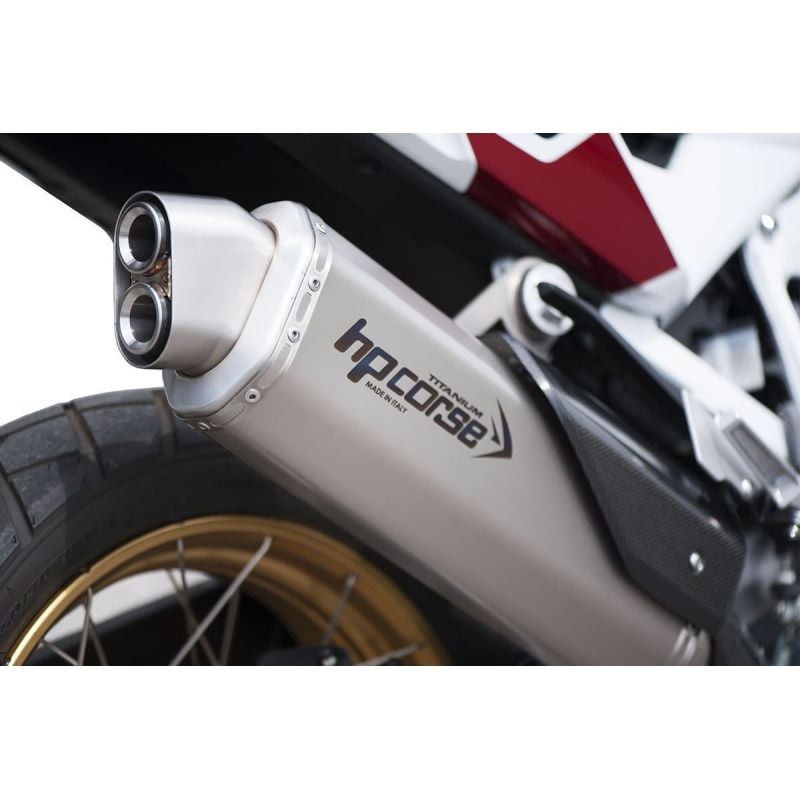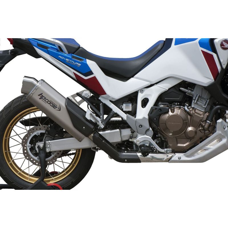 La nuova CRF 1100 Africa Twin è voglia totale di libertà, di grandi spazi, di sterrati pieni di polvere e sassi, ma anche di strade e di asfalto per arrivare ovunque ti porti la voglia di esplorare e conoscere. Cresce la cilindrata, che adesso è di 1084 cc, e insieme crescono la potenza e la coppia. Una moto alla quale HP CORSE ha dedicato due delle sue ultime creazioni: gli scarichi4-TRACK ReSPS CARBON(entrambiomologati Euro 5/5 Plus), nati nel cuore della Motor Valley, dove la qualità e il design sanno forgiare piccoli e grandi capolavori trasformando il metallo in qualcosa che ha davvero il sapore della passione e il nuovissimoSP-1.SP-1in titanio slip-on posizionato alto, una soluzione che ormai ci contraddistingue che oltre ad essere esteticamente bellissima, è anche funzionale in quanto preserva lo scarico -nella maggior parte delle volte- in caso di appoggio della moto a terra sul lato destro. Una scelta molto apprezzata per chi pratica fuoristrada e per chi viaggia con valige morbide. SP-1 è uno scarico con camicia in titanio di lunghezza 350 mm alla quale viene inciso il logo HP CORSE al laser, con leggerissimi fondelli conici stampati ed è dotato di un beccuccio di uscita fumi unico nel suo genere poiché privo di saldature all'angolo di piega. Il raccordo è in acciaio inox del tipo slip-on a sgancio rapido e viene accoppiato al terminale mediante boccole in acciaio tornite al CNC. Le cover in carbonio presenti in questa configurazione sono due: la prima più bassa che perfettamente prosegue stilisticamente la parte in acciaio originale sotto al collettore mentre la seconda più piccola protegge il passeggero da eventuali contatti col raccordo. Lo scarico è omologato Euro 5/5 Plus, dotato di certificato di omologazione, garanzia e istruzioni di montaggio.SP-1in versione bassa con lunghezza del corpo marmitta di 400 mm conferisce alla moto un design decisamente rallistico garantendo un sound profondo e prestazioni migliori in termini di coppia e potenza rispetto allo scarico di serie pur rimanendo nelle tolleranze previste dalla normativa europea. Camicia in titanio e titanio ceramizzato nero con logo inciso al laser, raccordo saldato a TIG e cover para calore integrata in fibra di carbonio. Omologato Euro 5/5 Plus, garanzia e istruzioni di montaggio a corredo.Il4-TRACK Rdedicato all’AFRICA TWIN ama i grandi spazi e l’avventura. Testato a lungo al banco e su tutte le strade (ON e OFF), rende ancora più aggressivo  il carattere della nuova CRF, che adesso si esalta ai bassi e medi regimi, garantendo massima affidabilità in qualsia situazione oltre a migliorarne le performance dinamiche grazie a un posteriore più leggero e snello, anche esteticamente.4-TRACK R è omologato Euro 5/5 Plus, ha la cover paracalore in carbonio, il raccordo slip-on, il fondello di forma ottagonale, un beccuccio idroformato senza saldature e un corpo silenziatore con logo Hp Corse inciso al laser. Disponibile in tre diversi materiali: titanio, acciaio satinato, acciaio ceramizzato nero.SPS CARBONdifferisce dal 4-TRACK R solo esteticamente poiché è dotato di un bellissimo finale in fibra di carbonio che va a rivestirne il beccuccio idroformato in acciaio.Omologato Euro 5/5 Plus, ha la cover paracalore in carbonio, il raccordo slip-on, il logo inciso al laser ed è disponibile in tre diversi materiali: titanio, acciaio satinato, acciaio ceramizzato nero.