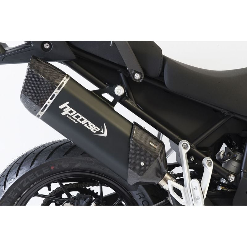 Ideati nel Centro R&D di Bologna, gli scarichi HP CORSE hanno la forma del corpo ottagonale per arrivare ai finali in carbonio davvero unici e bellissimi.Collaudati per resistere a qualsiasi sollecitazione, SP-3 CARBON e SPS CARBON nascono per accompagnare i fan dell’avventura attraverso le strade e i sentieri di tutto il mondo.Provati a lungo al banco e su qualsiasi tipo di strada e terreno, SP-3 CARBON e SPS CARBON assicurano una totale affidabilità e prestazioni migliori rispetto allo scarico originale, soprattutto ai bassi e ai medi regimi, garantendo una migliore coppia a vantaggio della fluidità di guida.Gli involucri sono realizzati in tre diversi materiali, Titanio, Acciaio Ceramizzato nero e Acciaio satinato.SP-3 CARBON e SPS CARBON sono dotati di un para-calore in fibra di carbonio. Hanno il logo inciso al laser e sono disponibili nella versione Slip-On perfettamente adattabile ai collettori originali.Omologati Euro 5.