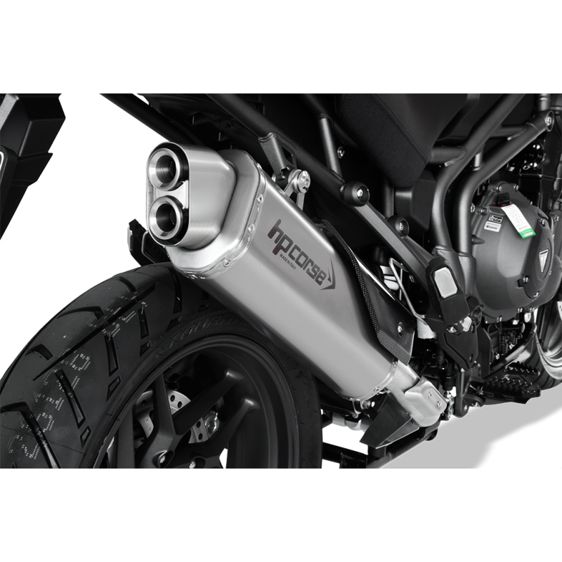 Alla nuova famiglia di Triumph Tiger 1200 appartengono moto pensate per essere guidate puntando in ogni momento al divertimento e alla sicurezza, con tecnologie innovative, una ergonomia ottimizzata e importanti aggiornamenti al motore. Come per il vecchio modello, le categorie sono due: i modelli XR, progettati per raggiungere l’eccellenza su strada, mentre i modelli XC garantiscono la migliora esperienzasu qualsiasi superficie, ON o OFF che sia. Anche i nuovi modelli mantengono la loro grande maneggevolezza, una posizione di guida alta e un profilo deciso per uno stile, un controllo e un comfort superiori. Le nuove Tiger hanno un motore 3 cilindri di 1215 cc incredibilmente potente e un peso inferiore rispetto alla precedente generazioni. Per rendere ancora più sorprendente questa nuova generazione di TIGER 1200, HP CORSE le ha dedicato una nuova linea di scarichi, muscolosi e potenti. Disponibili in tre diversi materiali (Titanio, Acciaio Satinato, Acciaio Nero) e con forme forti ma slanciate, sono in grado di ridisegnare la zona posteriore della maxi endurona inglese esaltandone le qualità estetiche, la maneggevolezza e il suono. Testati al banco e su strada, garantiscono grande affidabilità, un peso ridotto rispetto all’originale Triumph oltre a migliorare le prestazioni del tre cilindri di Hinckley in particolare ai bassi e ai medi regimi. Omologati Euro 4, hanno il fondello di forma ottagonale, il beccuccio idroformato senza saldature oppure in fibra di carbonio.OMOLOGATO EURO 4 (UE) nr. 134/2014 e 2016/1824 G.