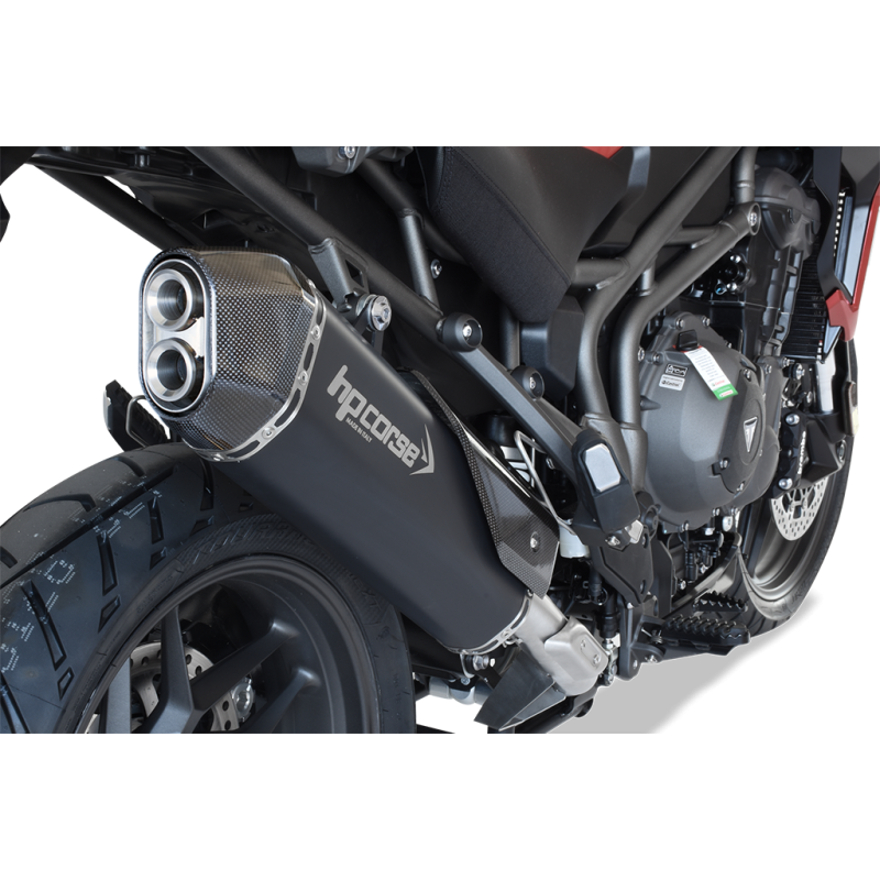 Alla nuova famiglia di Triumph Tiger 1200 appartengono moto pensate per essere guidate puntando in ogni momento al divertimento e alla sicurezza, con tecnologie innovative, una ergonomia ottimizzata e importanti aggiornamenti al motore. Come per il vecchio modello, le categorie sono due: i modelli XR, progettati per raggiungere l’eccellenza su strada, mentre i modelli XC garantiscono la migliora esperienzasu qualsiasi superficie, ON o OFF che sia. Anche i nuovi modelli mantengono la loro grande maneggevolezza, una posizione di guida alta e un profilo deciso per uno stile, un controllo e un comfort superiori. Le nuove Tiger hanno un motore 3 cilindri di 1215 cc incredibilmente potente e un peso inferiore rispetto alla precedente generazioni. Per rendere ancora più sorprendente questa nuova generazione di TIGER 1200, HP CORSE le ha dedicato una nuova linea di scarichi, muscolosi e potenti. Disponibili in tre diversi materiali (Titanio, Acciaio Satinato, Acciaio Nero) e con forme forti ma slanciate, sono in grado di ridisegnare la zona posteriore della maxi endurona inglese esaltandone le qualità estetiche, la maneggevolezza e il suono. Testati al banco e su strada, garantiscono grande affidabilità, un peso ridotto rispetto all’originale Triumph oltre a migliorare le prestazioni del tre cilindri di Hinckley in particolare ai bassi e ai medi regimi. Omologati Euro 4, hanno il fondello di forma ottagonale, il beccuccio idroformato senza saldature oppure in fibra di carbonio.